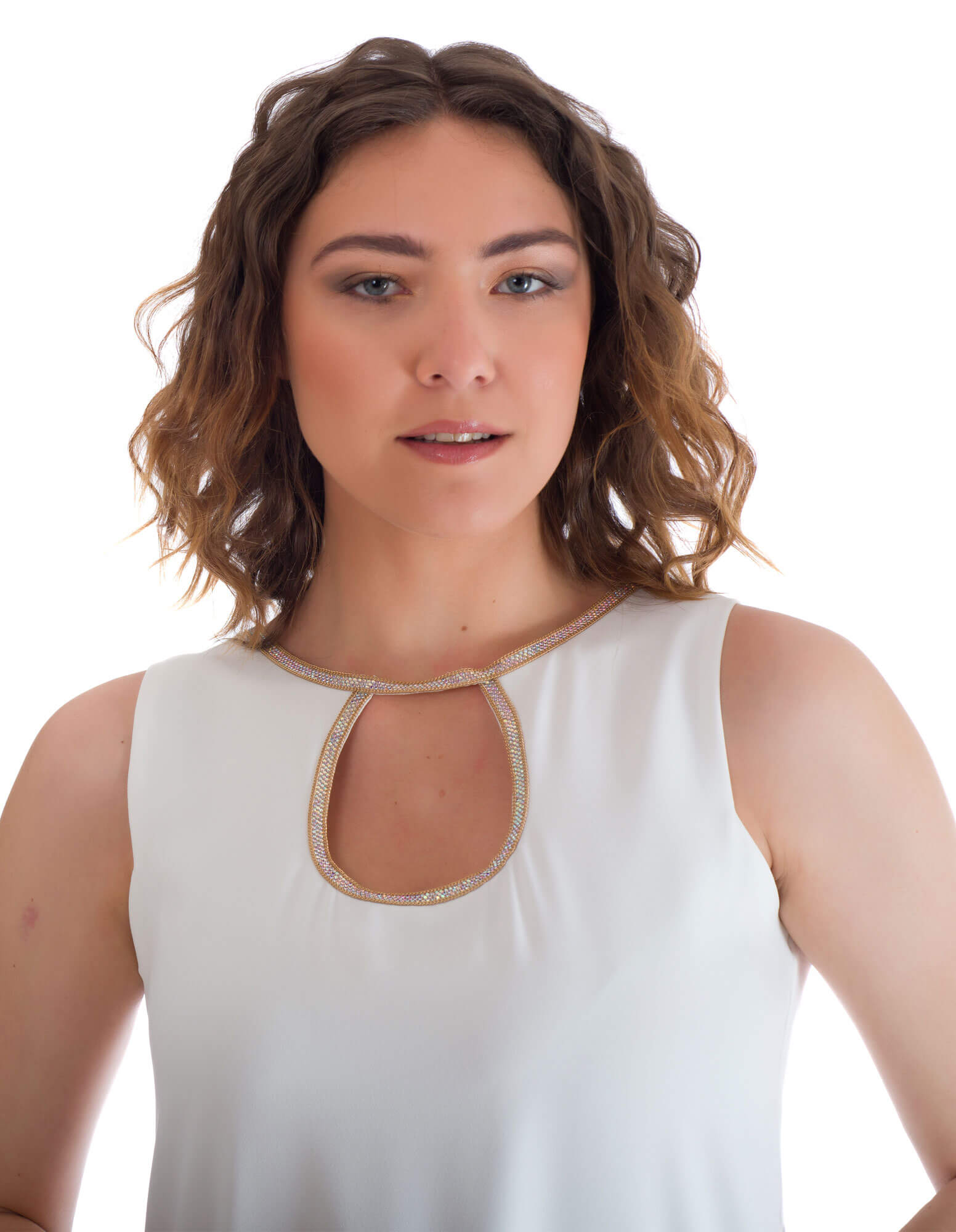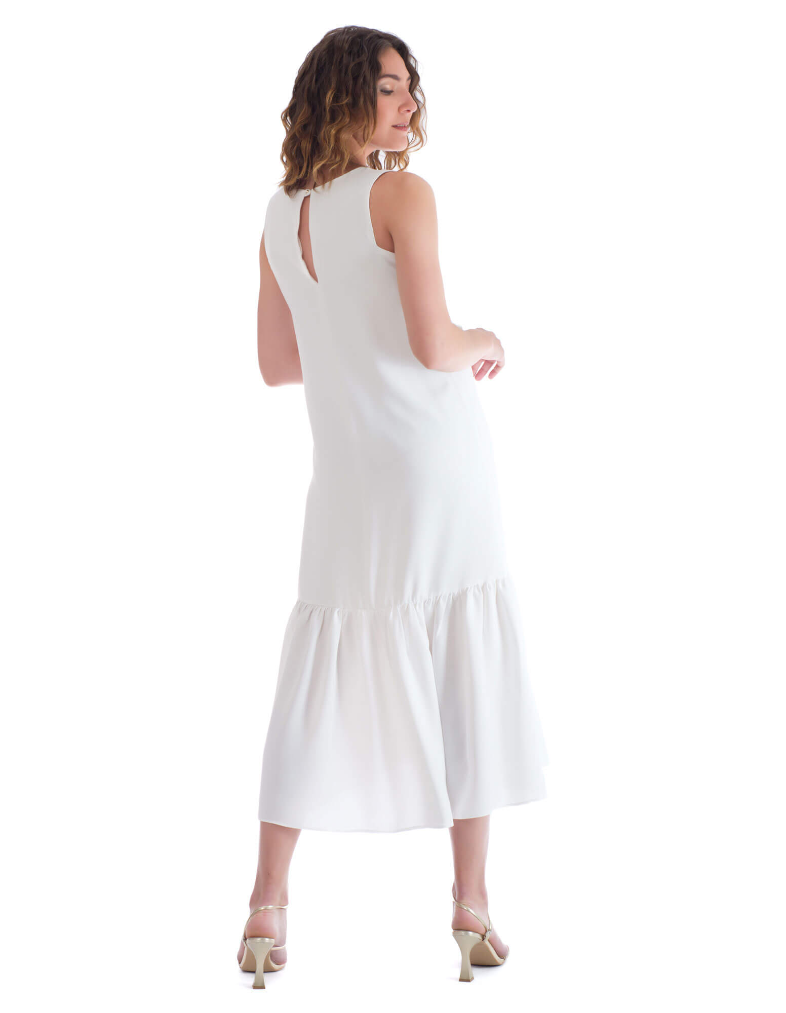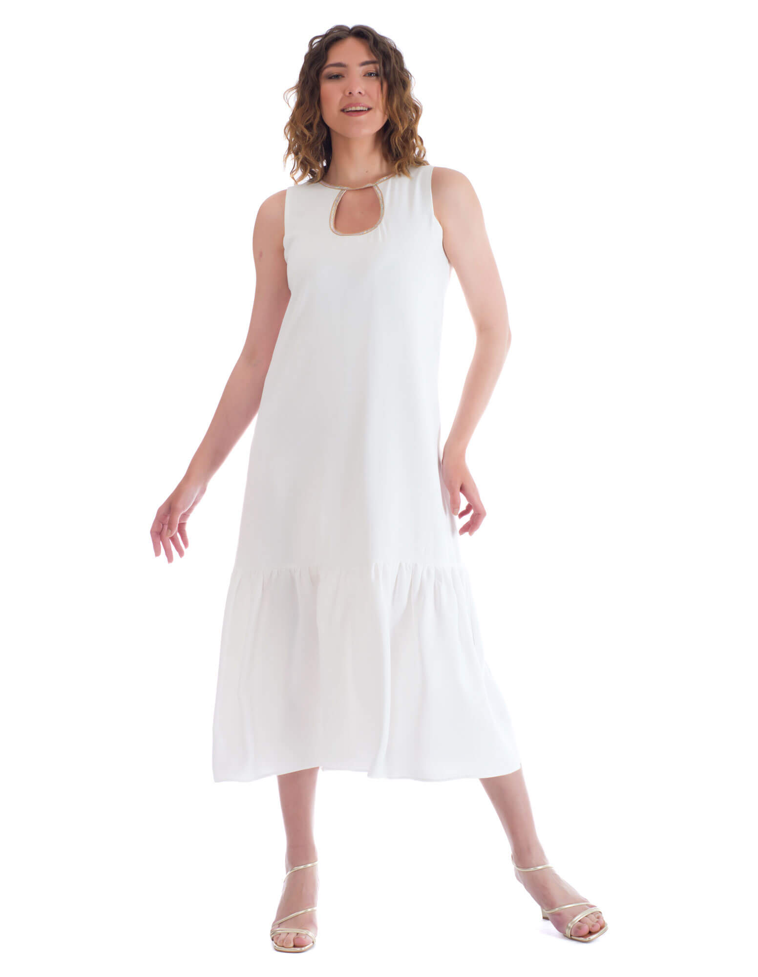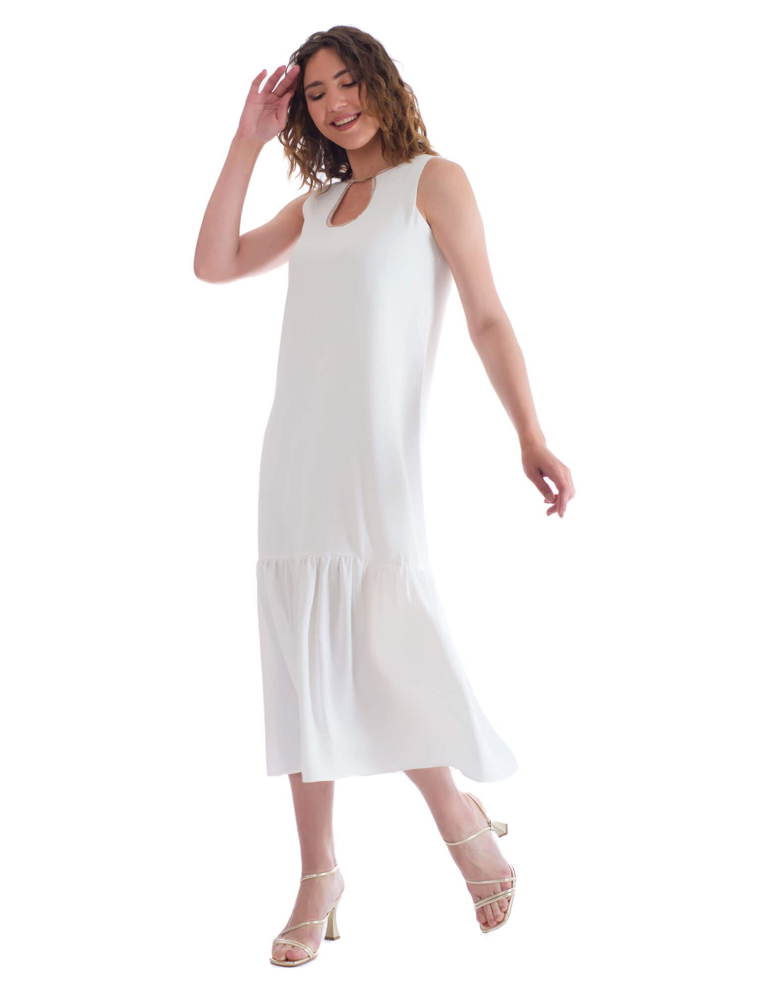 Ένα φινετσάτο φόρεμα σε άσπρο χρώμα και χρυσές στρασάτες λεπτομέρειες στο λαιμό του μπούστου σε ίσια γραμμή με βολάν κάτω.