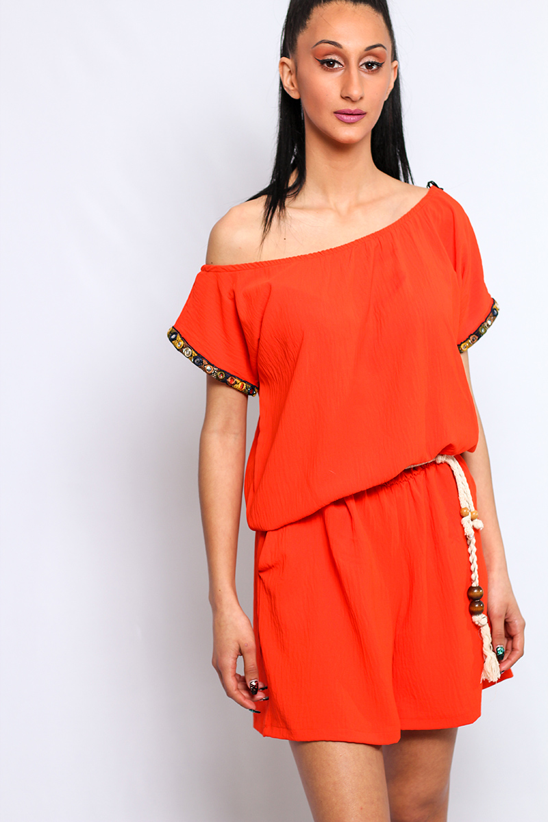Ολόσωμο σορτς. Επιλέγοντας το χρώμα που θέλεις για τις καλοκαιρινές σου βόλτες. Ολόσωμο με έναν ώμο, διακοσμητική τρέσα, έθνικ κοντό μανίκι, τσέπες εμπρός.