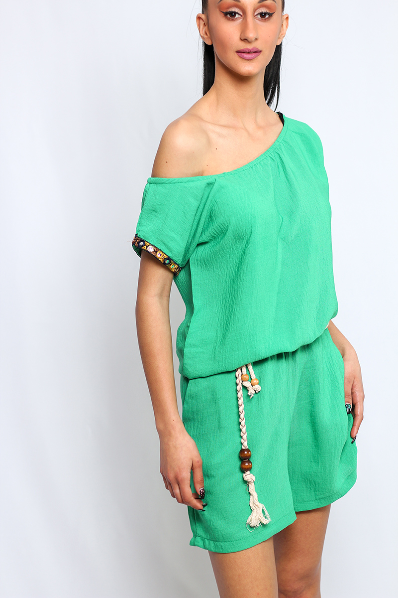 Ολόσωμο σορτς. Επιλέγοντας το χρώμα που θέλεις για τις καλοκαιρινές σου βόλτες. Ολόσωμο με έναν ώμο, διακοσμητική τρέσα, έθνικ κοντό μανίκι, τσέπες εμπρός.
