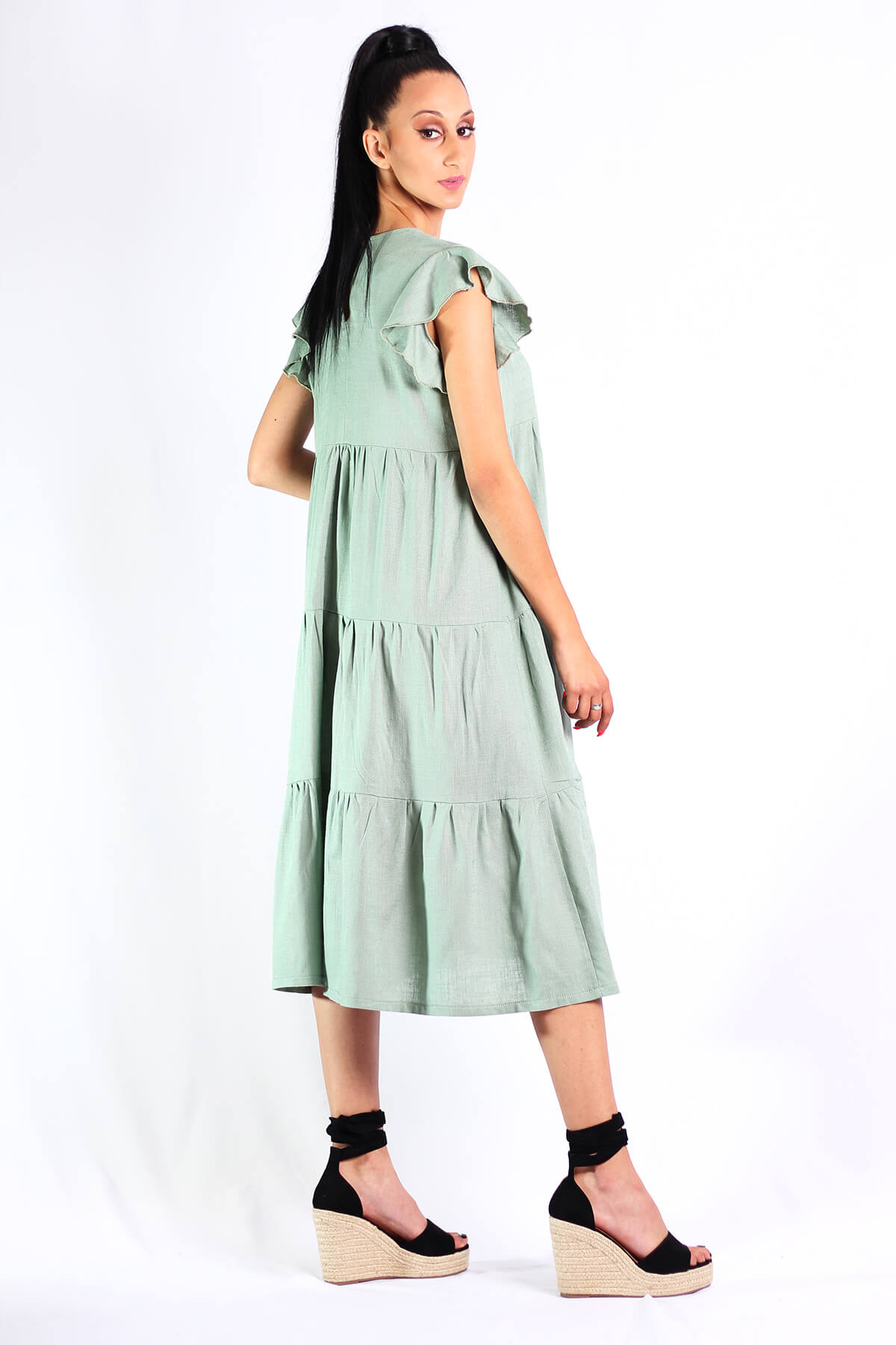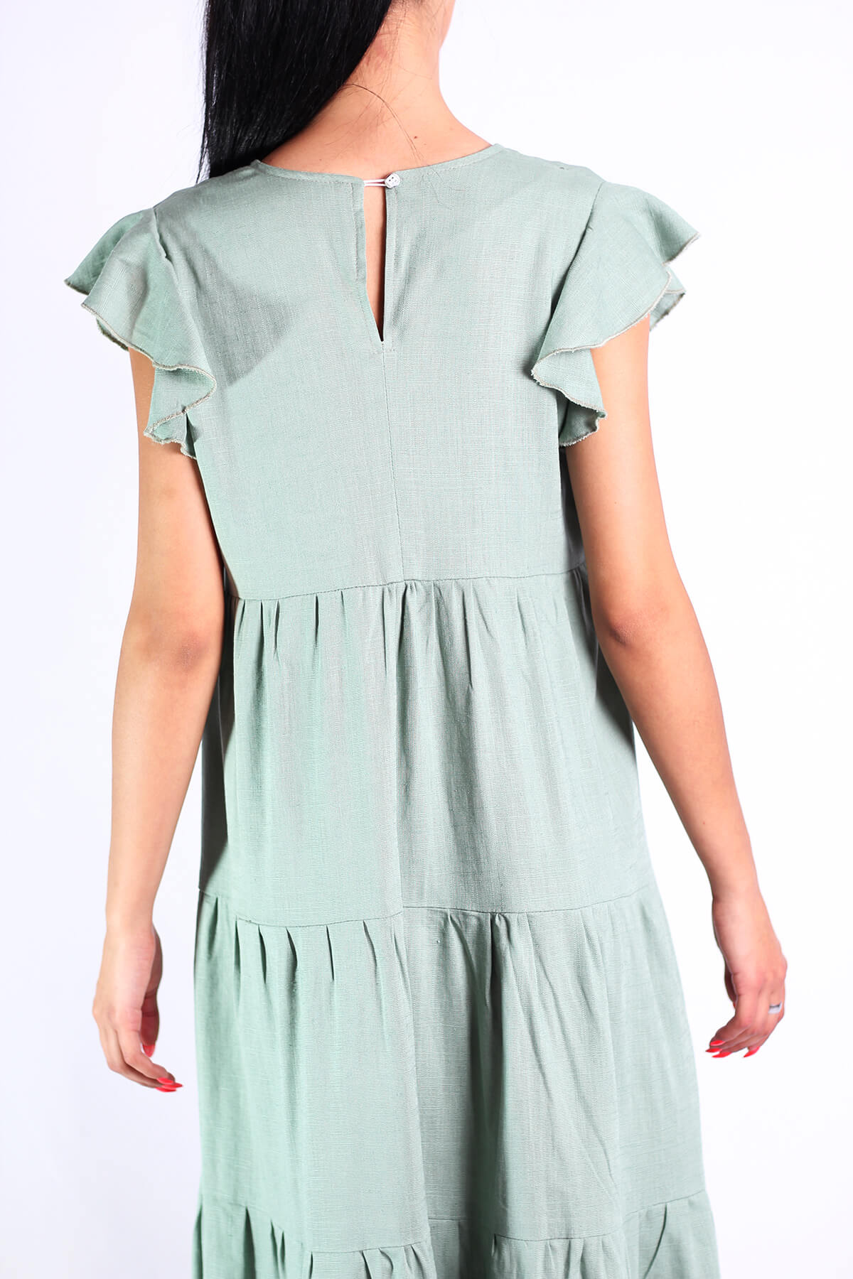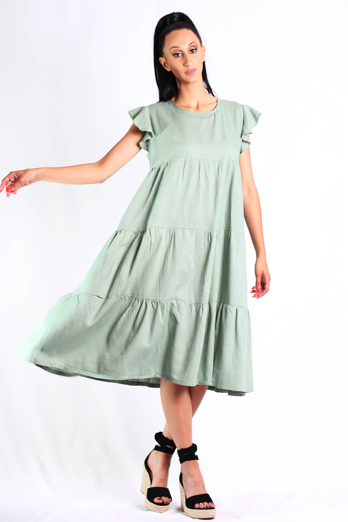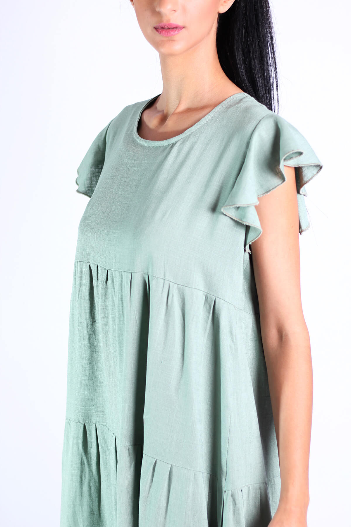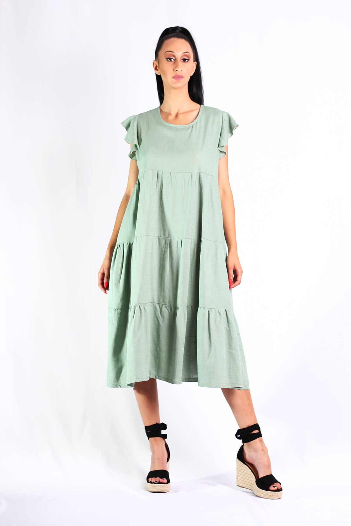Λινό φόρεμα με όγκο BALLOON που καλύπτει και plus size μέγεθος με βολάν που φέρουν ωραία κίνηση σε ιδανικό μήκος του ποδιού. Στρογγυλή λαιμόκοψη και χαριτωμένο κοντό μανίκι.