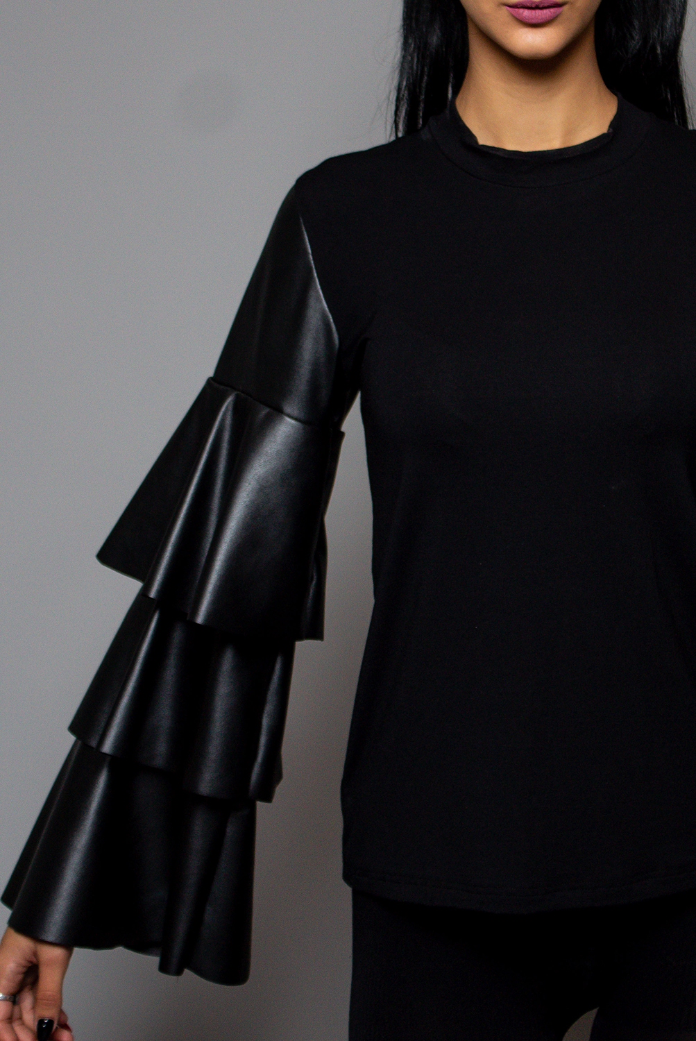 Μπλούζα με δερματίνη και μανίκι βολάν
