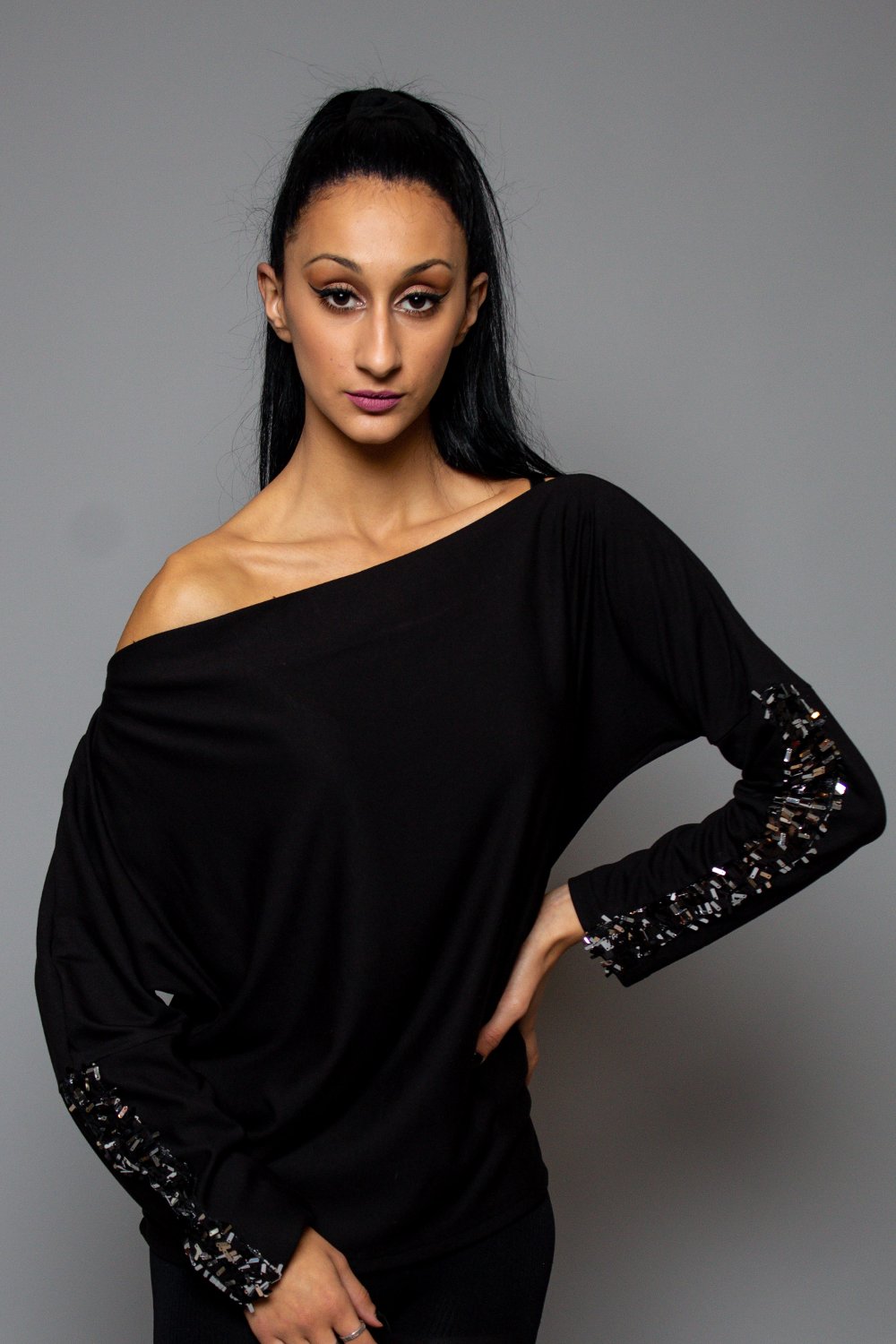 Μπλούζα μαύρη με βαθύ χαμόγελο, ώμο έξω και διακόσμηση παγίετα μανίκι με υπέροχη υφή, εσωτερική επένδυση