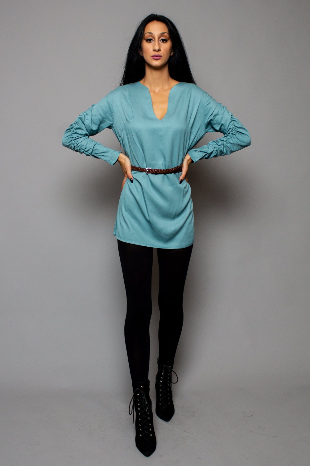 Μπλούζα pastel με σκίσιμο, πλαϊνή με σούρες στο μανίκι και άνοιγμα στο μπούστο