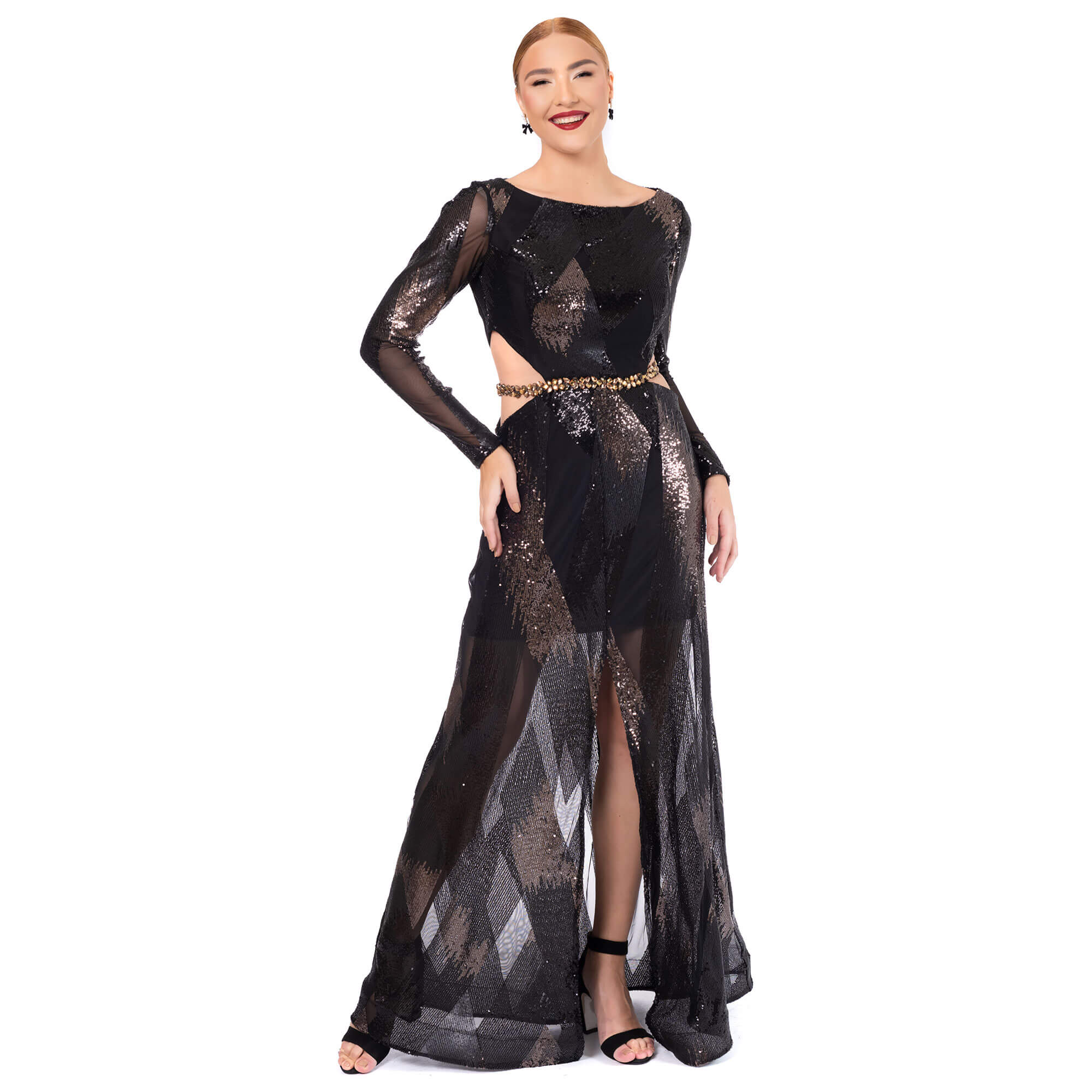 Ένα ονειρεμένο μάξι φόρεμα με ιδιαίτερη παγιέτα τρίχρωμη ίσια γραμμή και μακριά μανίκια.