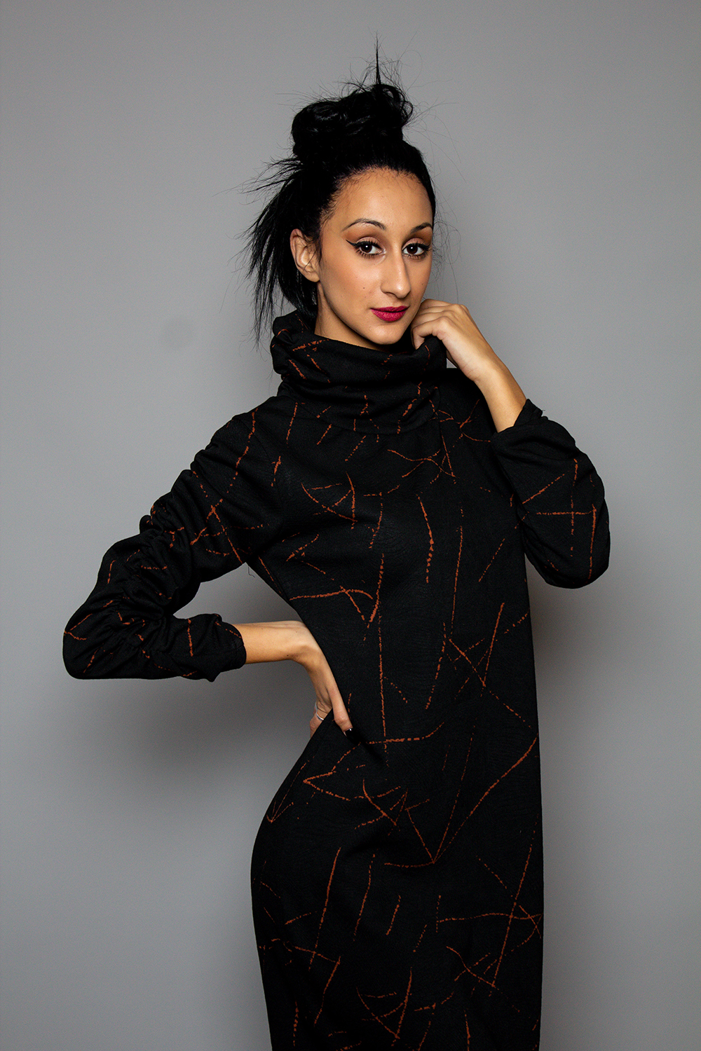 Φόρεμα ζιβάγκο μαύρο με κεραμυδί, γεωμετρικά μεγάλο λαιμό με σούρα και μανίκι με σούρα