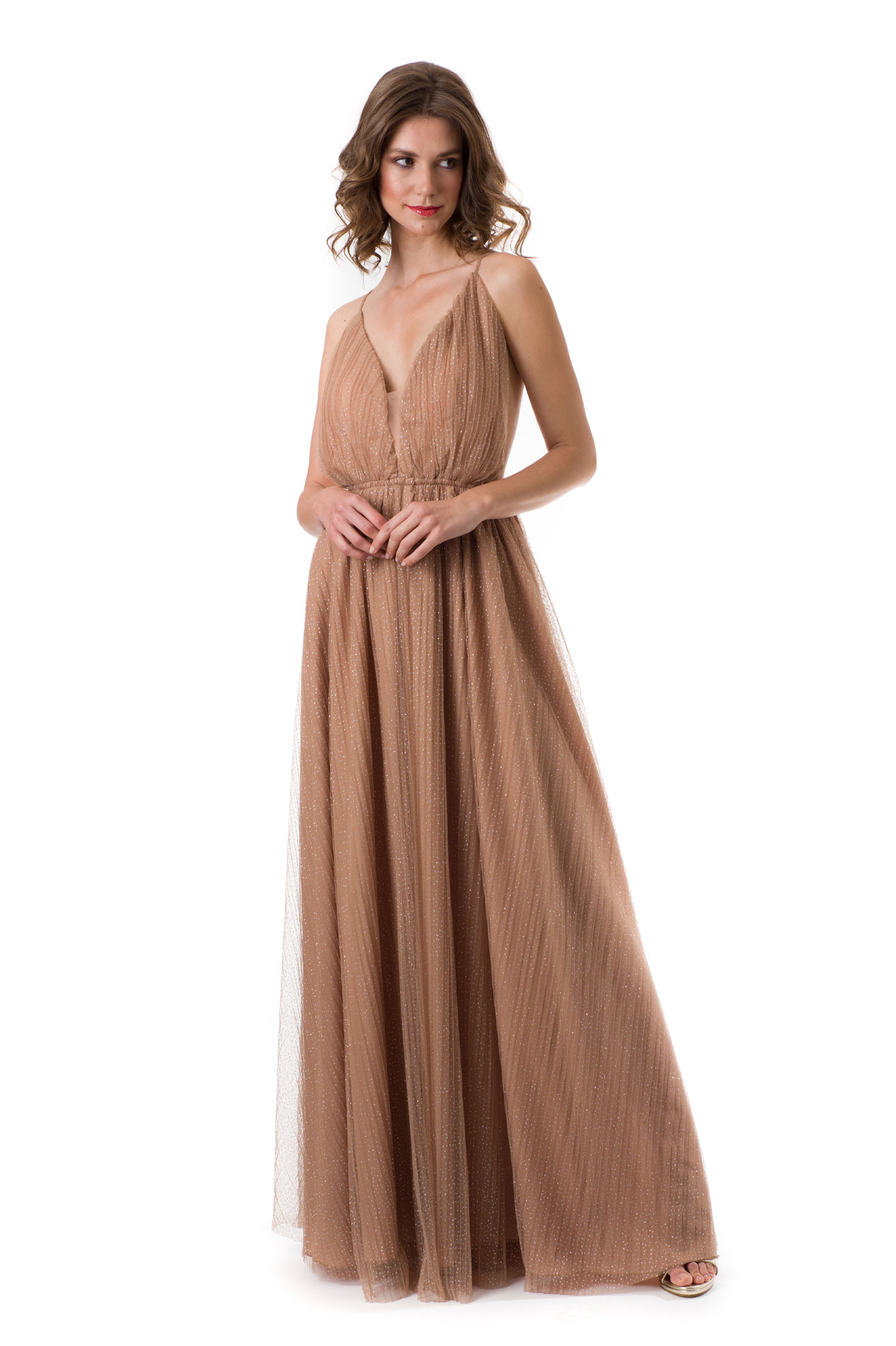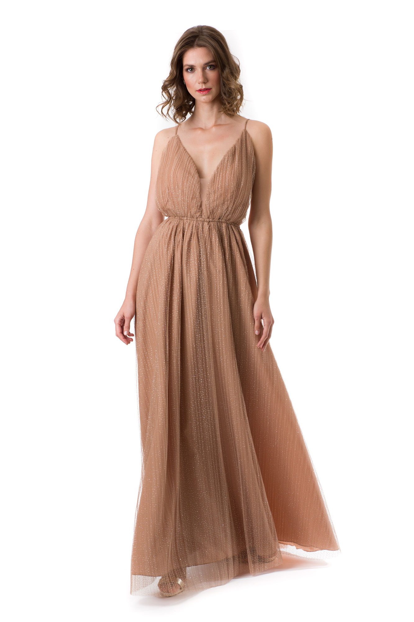 Φέτος δημιουργήσαμε το τούλινο πλισέ λαμπερό φόρεμα με αισθησιακή ανοιχτή πλάτη, λεπτές ράντες, λάστιχο στην μέση με λίγη σούρα.