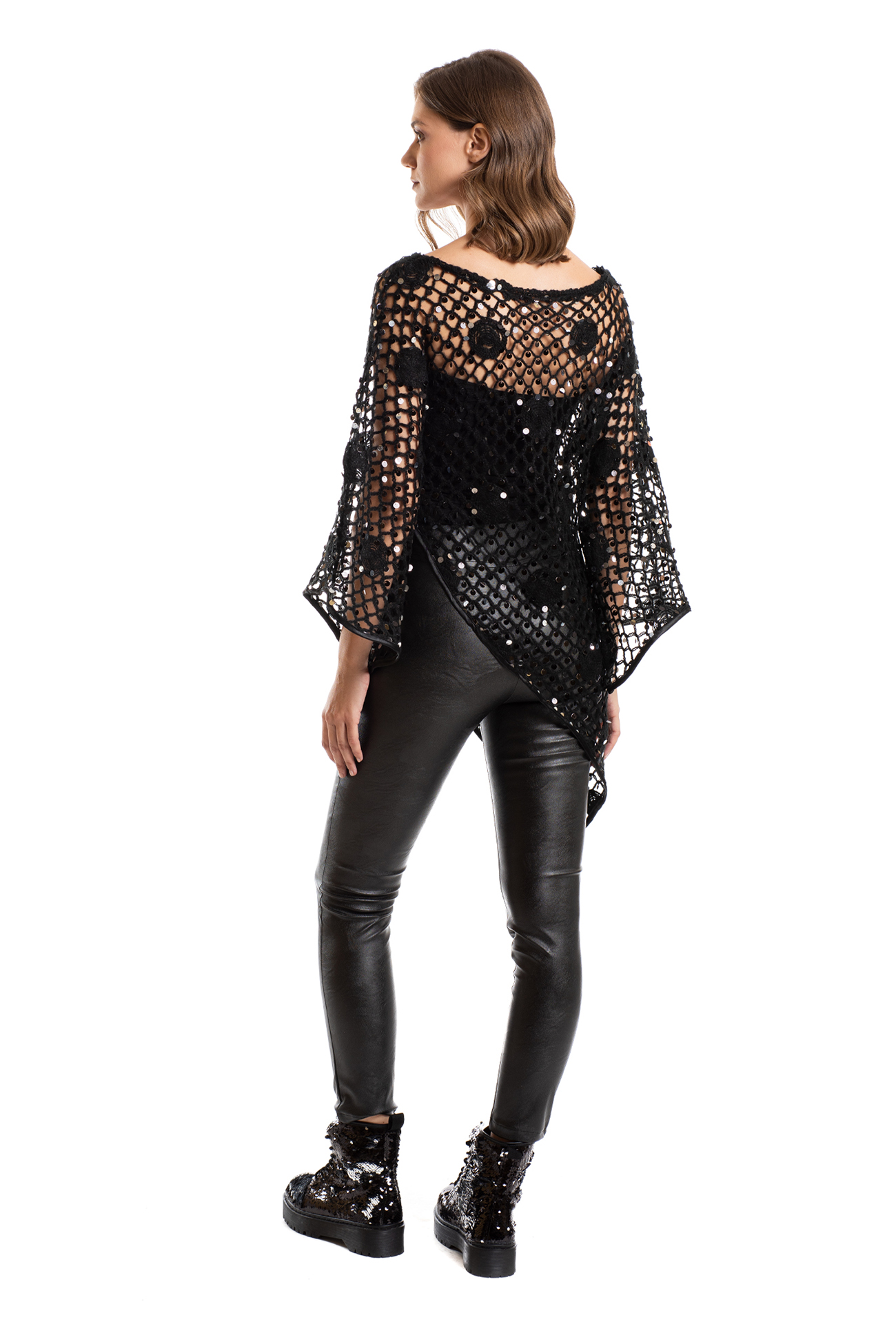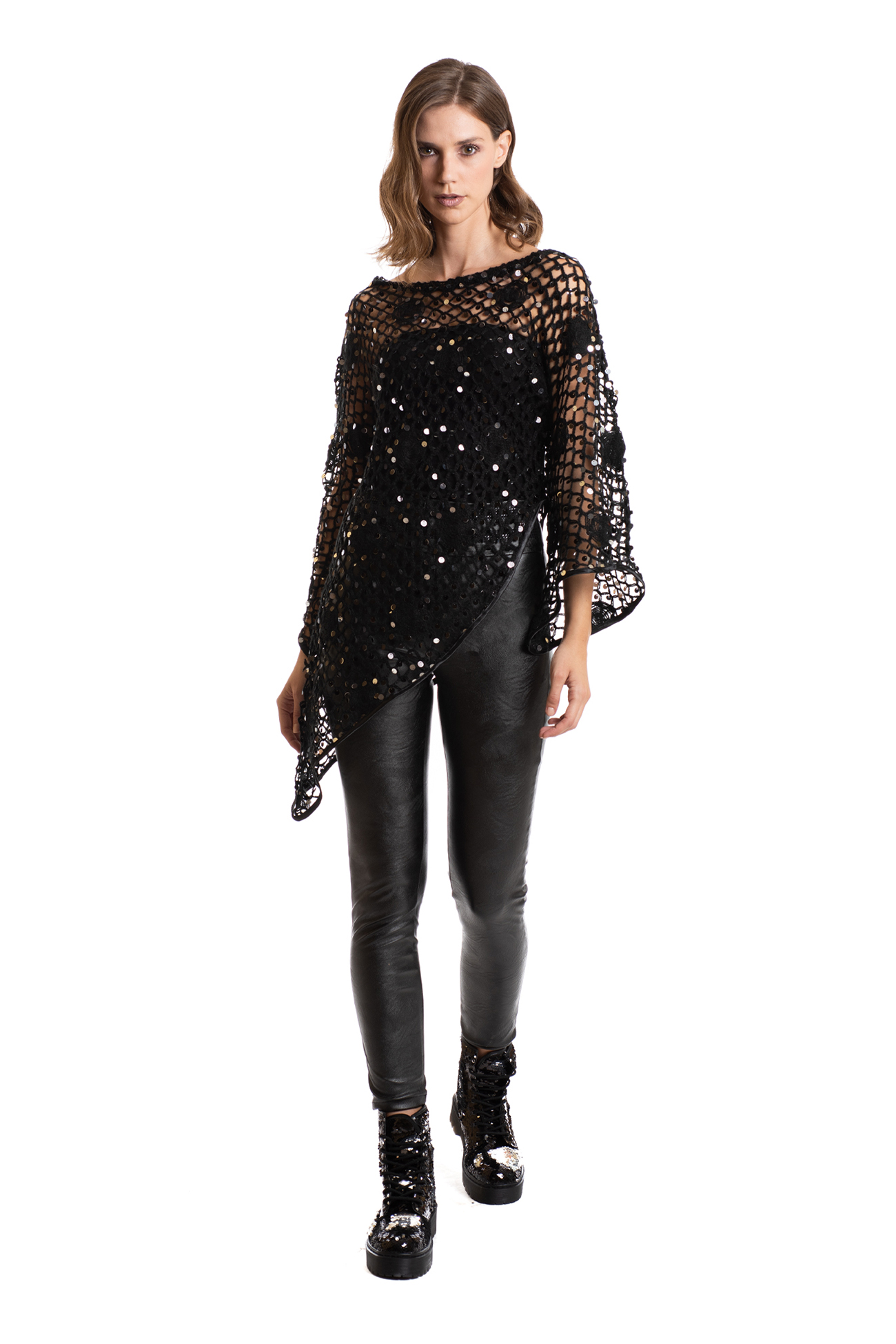 Μπλούζα ασύμμετρη δίχτυ. Πλεκτή ύφανση διακοσμημένη με παγιέτες. Μανίκι καμπάνα με μύτη. Ιδανικός συνδυασμός ένα δερμάτινο κολλητό παντελόνι και εσωτερικό τοπ της επιλογής σας.