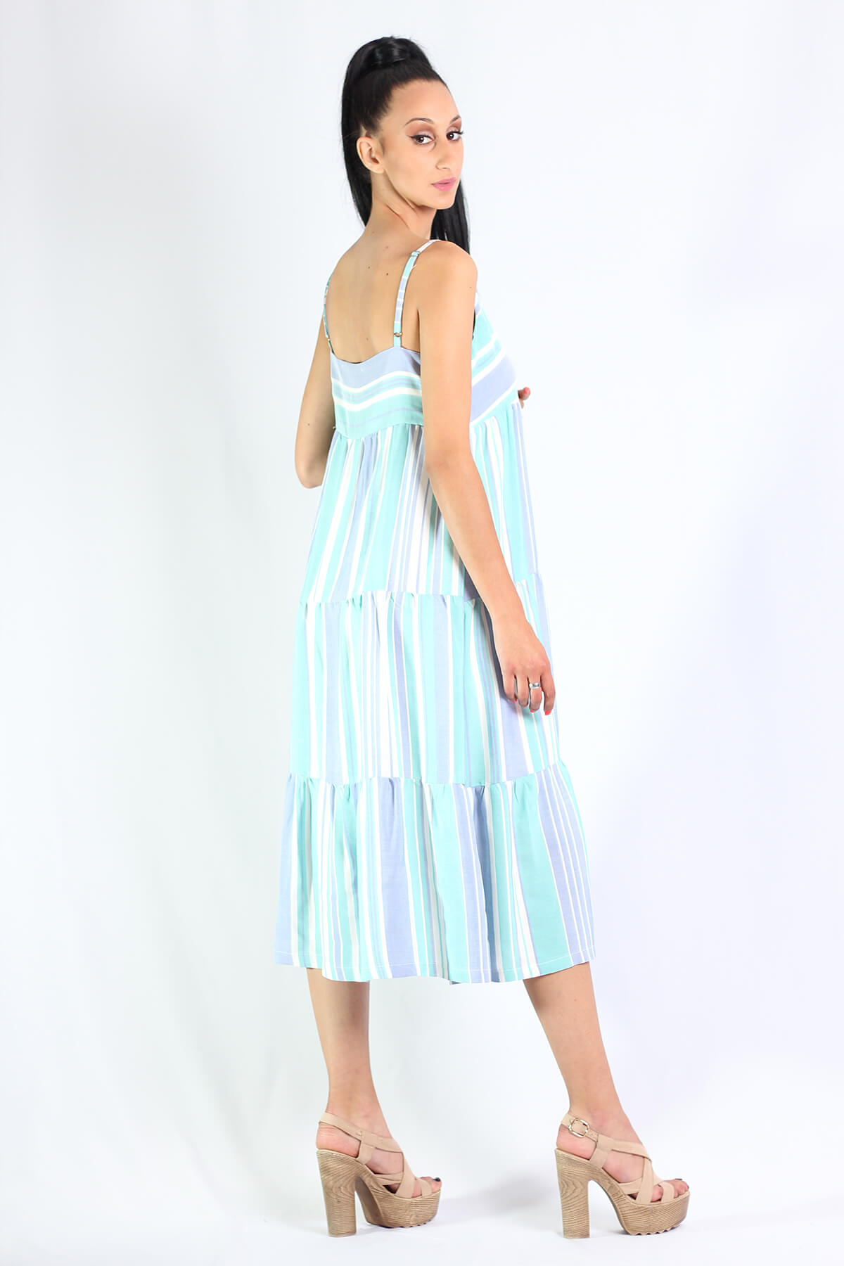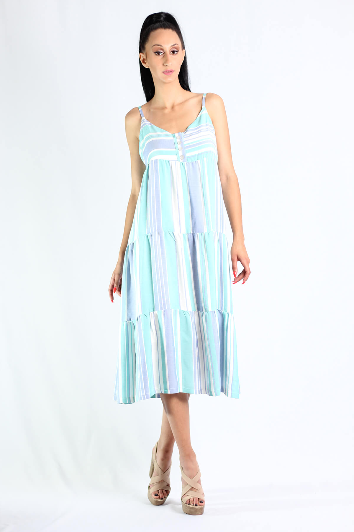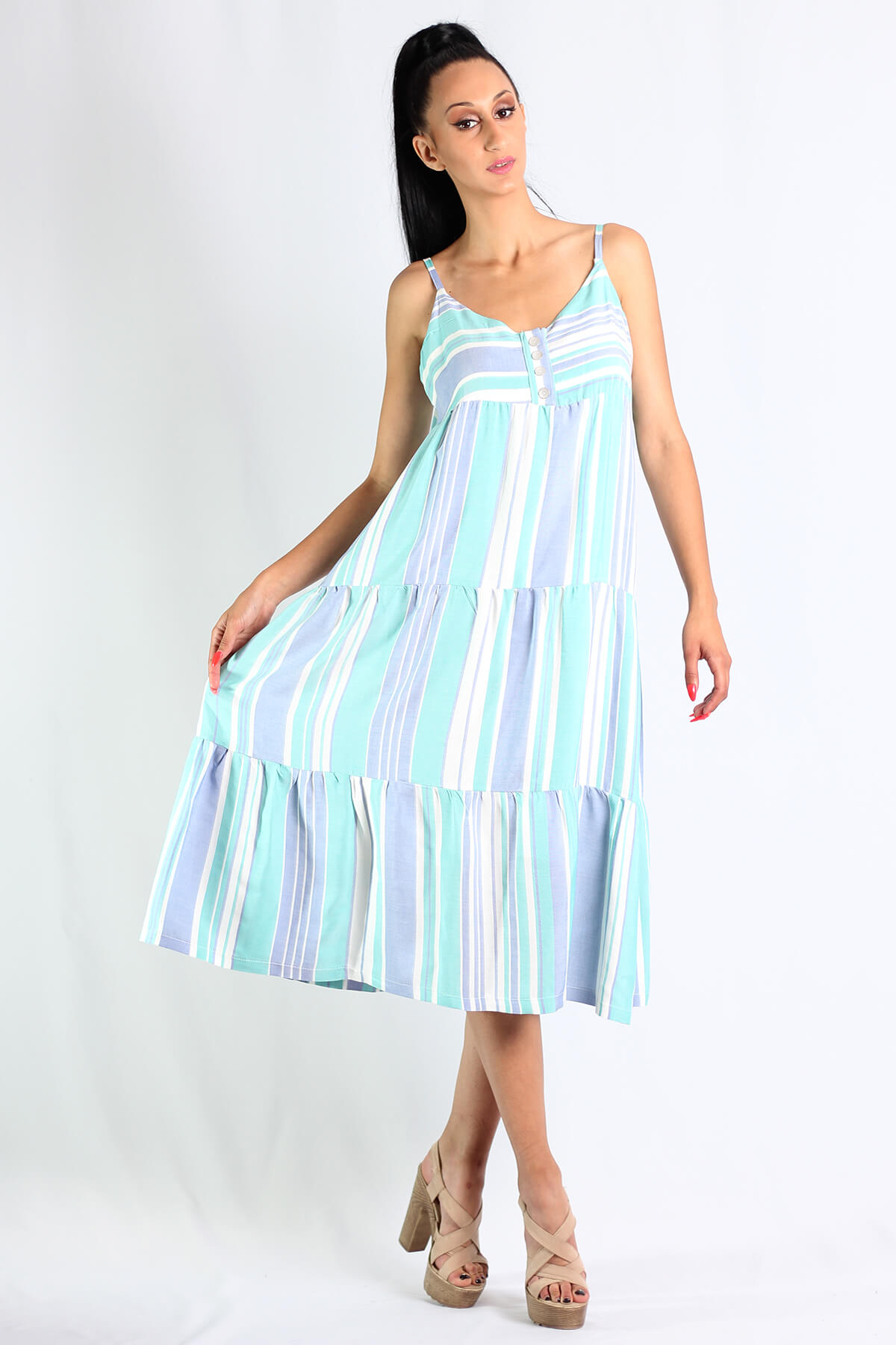 Ένα υπέροχο αέρινο φόρεμα σε αμπίρ γραμμή και βολάν. Διαθέτει ρυθμιζόμενες ράντες και τετραγωνισμένο μπούστο με κουμπιά. Ωραία κίνηση σε ένα ανάλαφρο και Chic look.