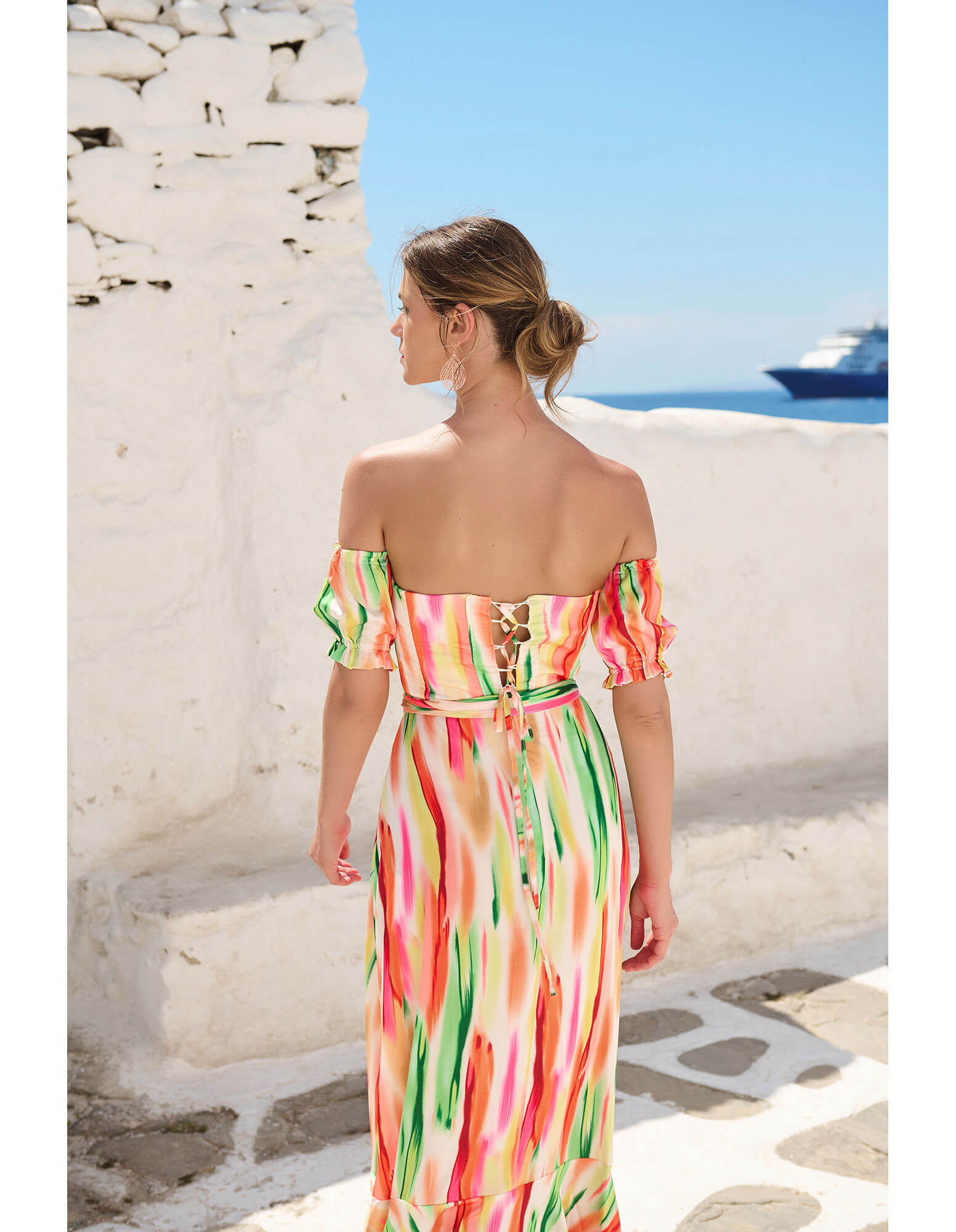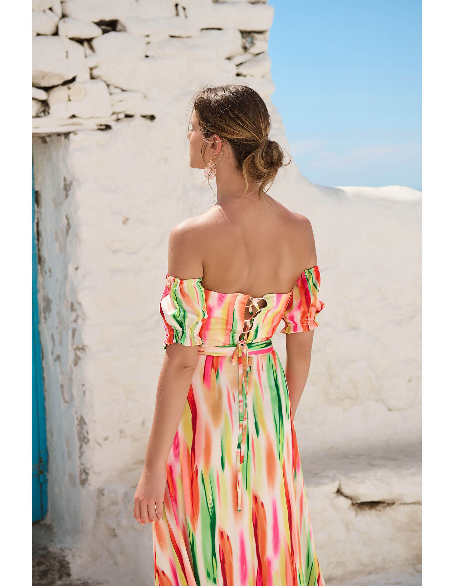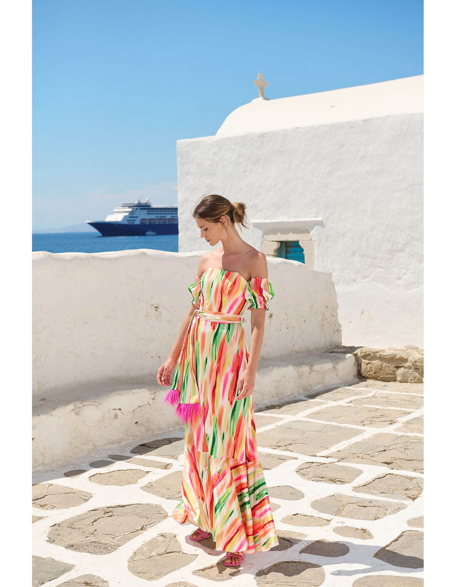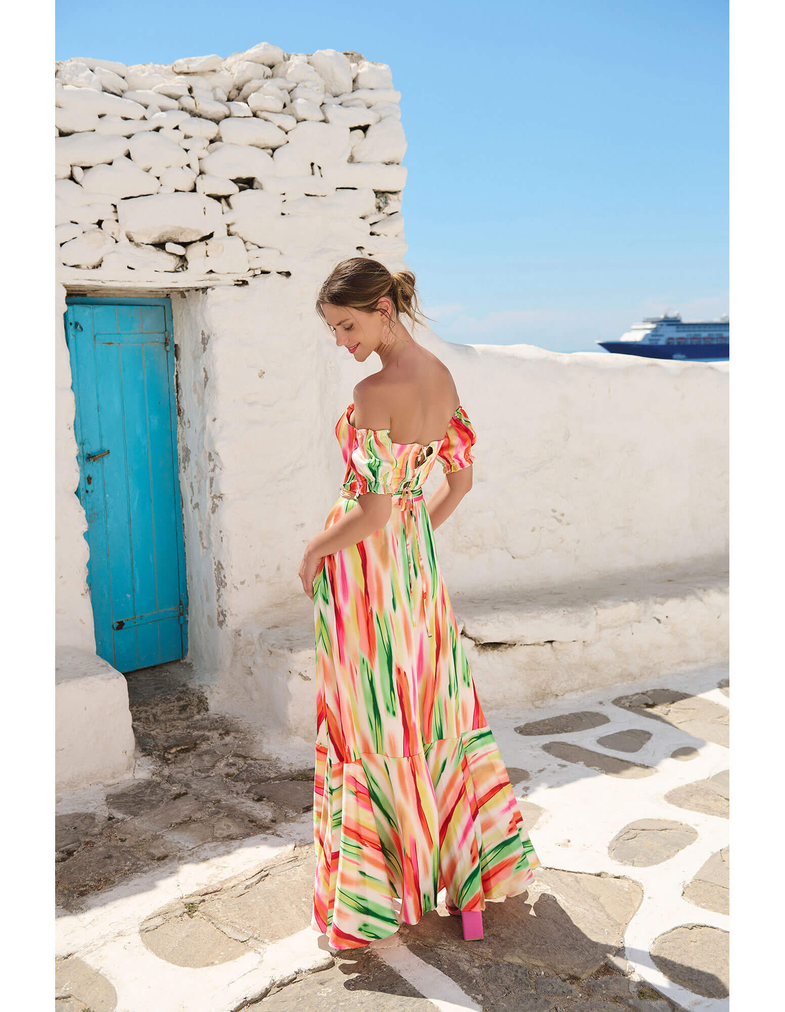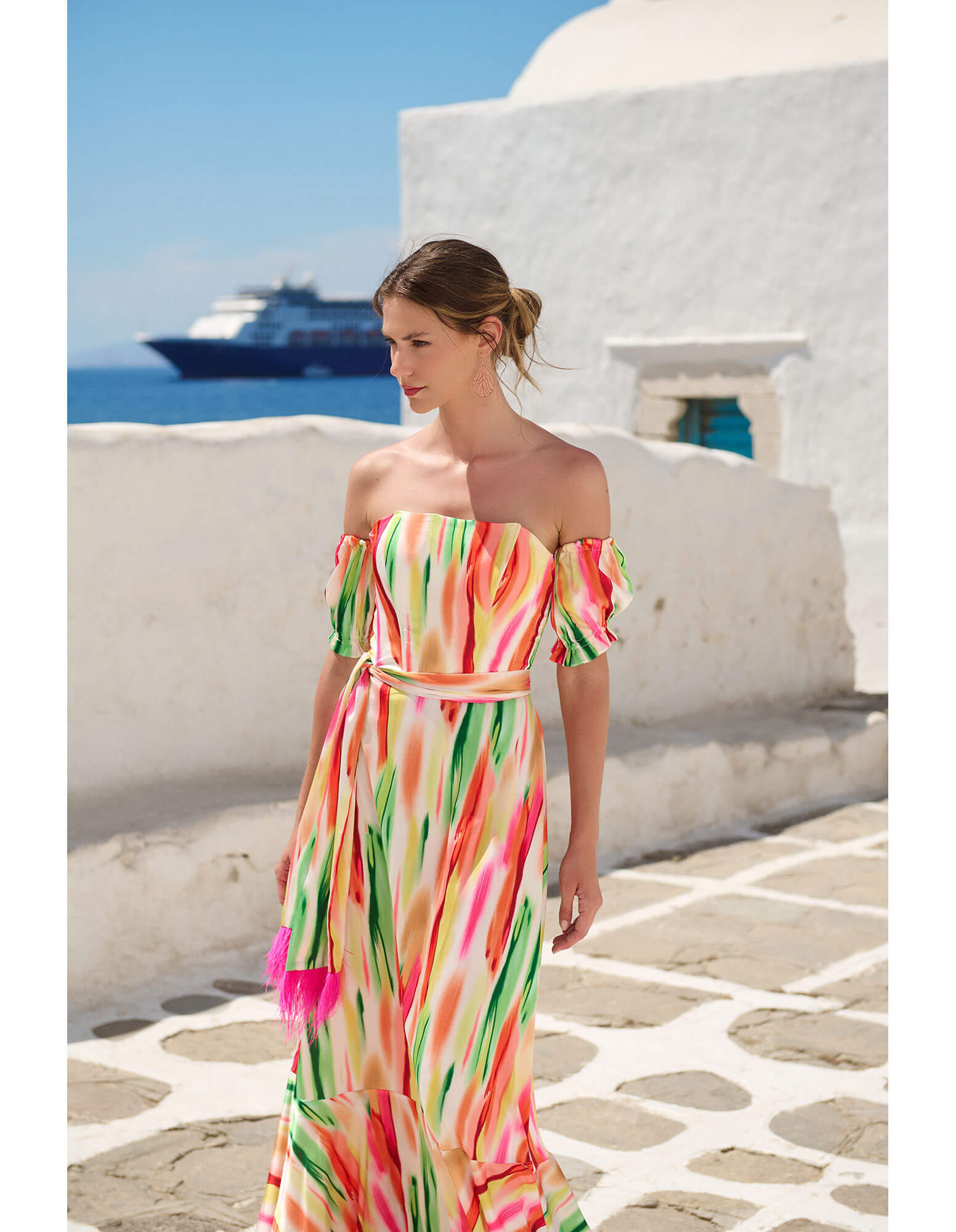 Το απόλυτο αέρινο εμπριμέ μάξι φόρεμα σατινένιο σε συνδυασμό με μετάξι.