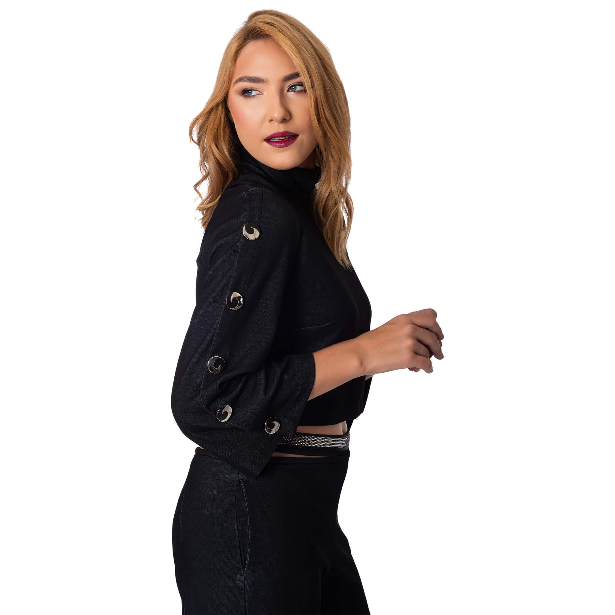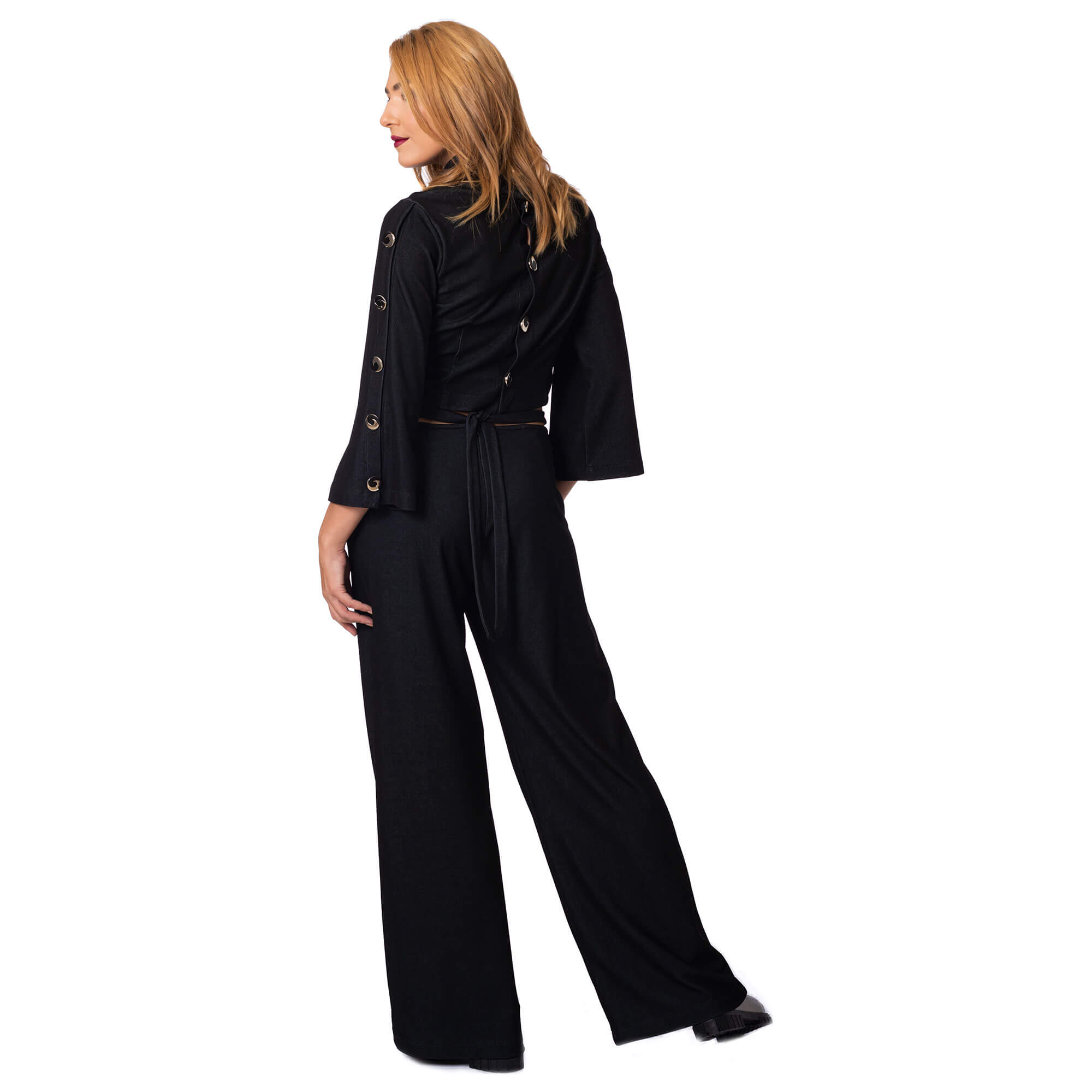 Μπλούζα με μικρό λαιμό, άνετη γραμμή άλφα που διακοσμούν κουμπιά στο πίσω μέρος της πλάτης και τα μανίκια.