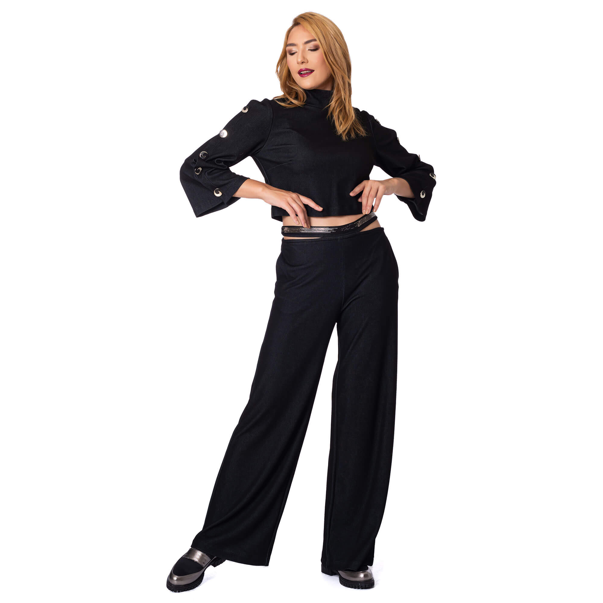 Το παντελόνι με κρύο φερμουάρ πίσω και το ενσωματωμένο ζωνάκι με στρας στην μέση.
