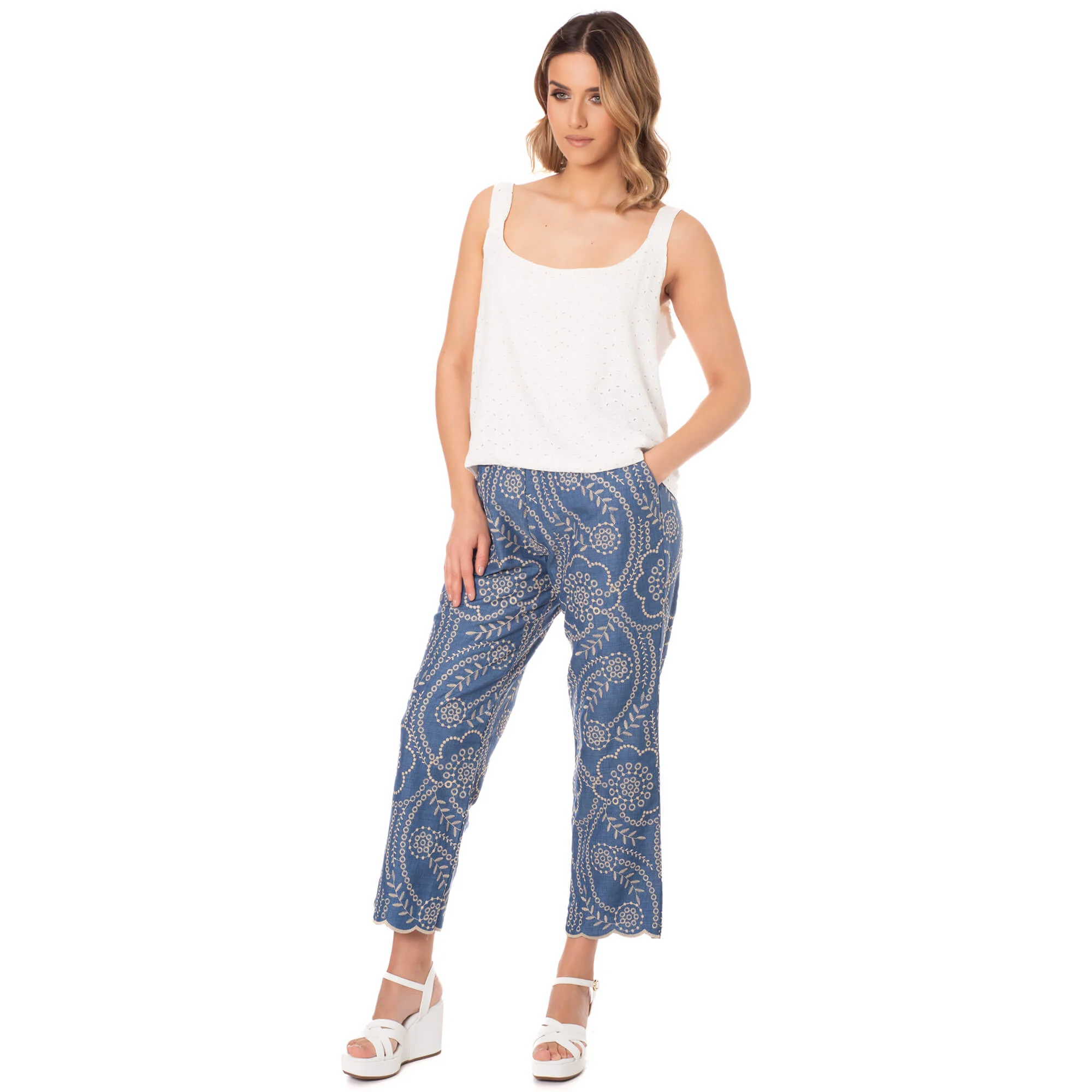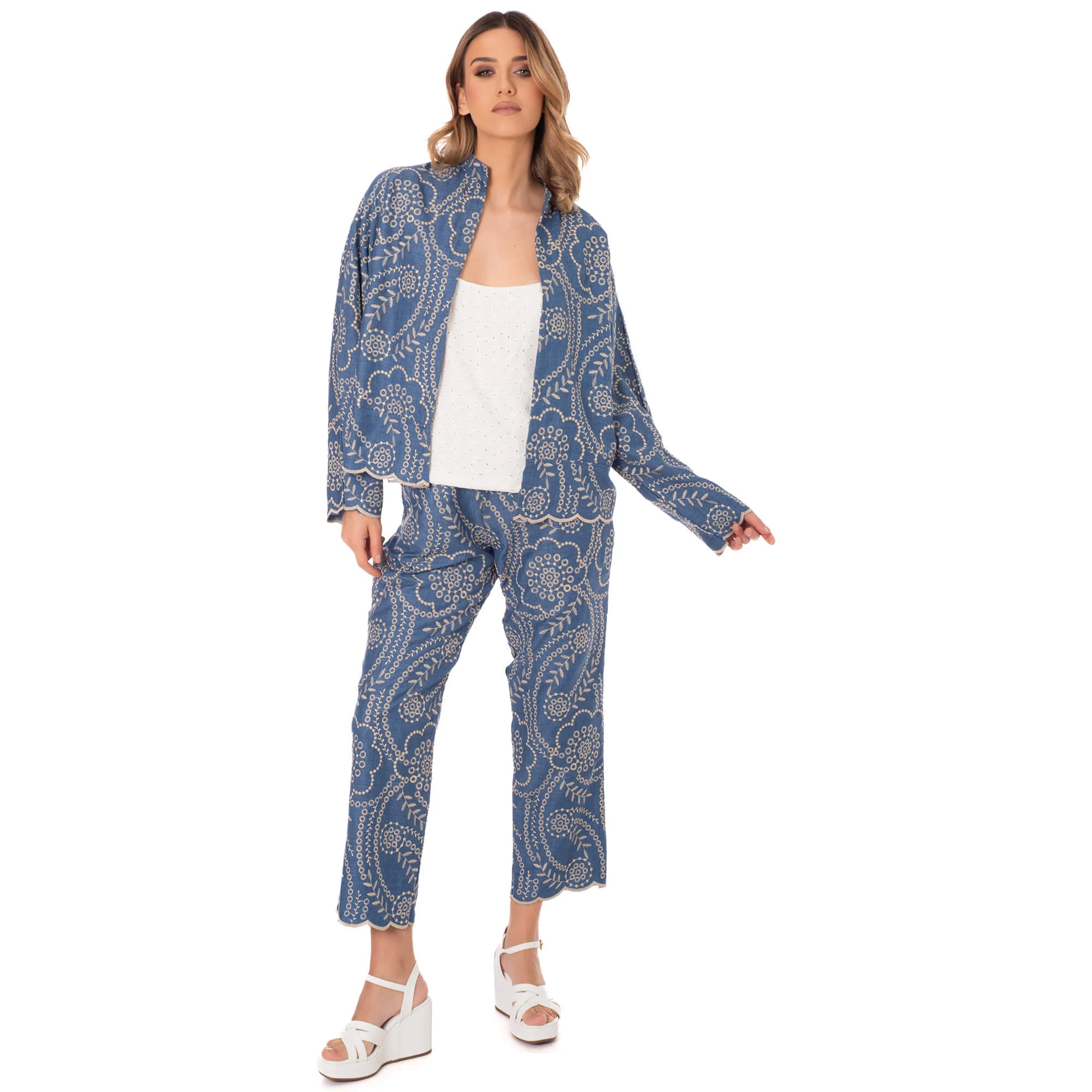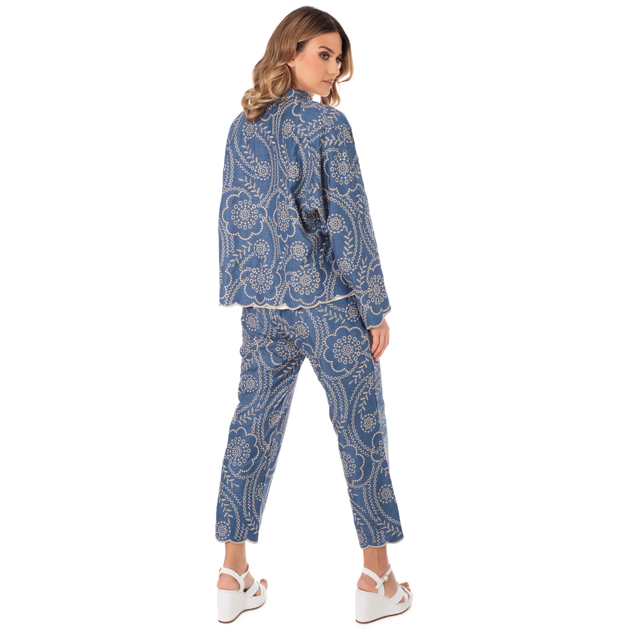 Το set broderie αποτελείται από τζάκετ σε oversize με μανίκια και παπαδίστικο γιακά, και το παντελόνι με λάστιχο στην μέση για άνεση με τσέπες στις πλαϊνές του.