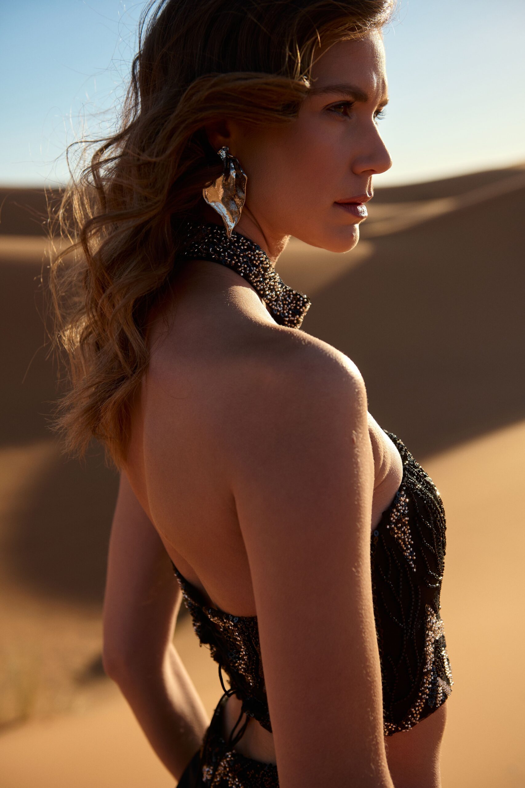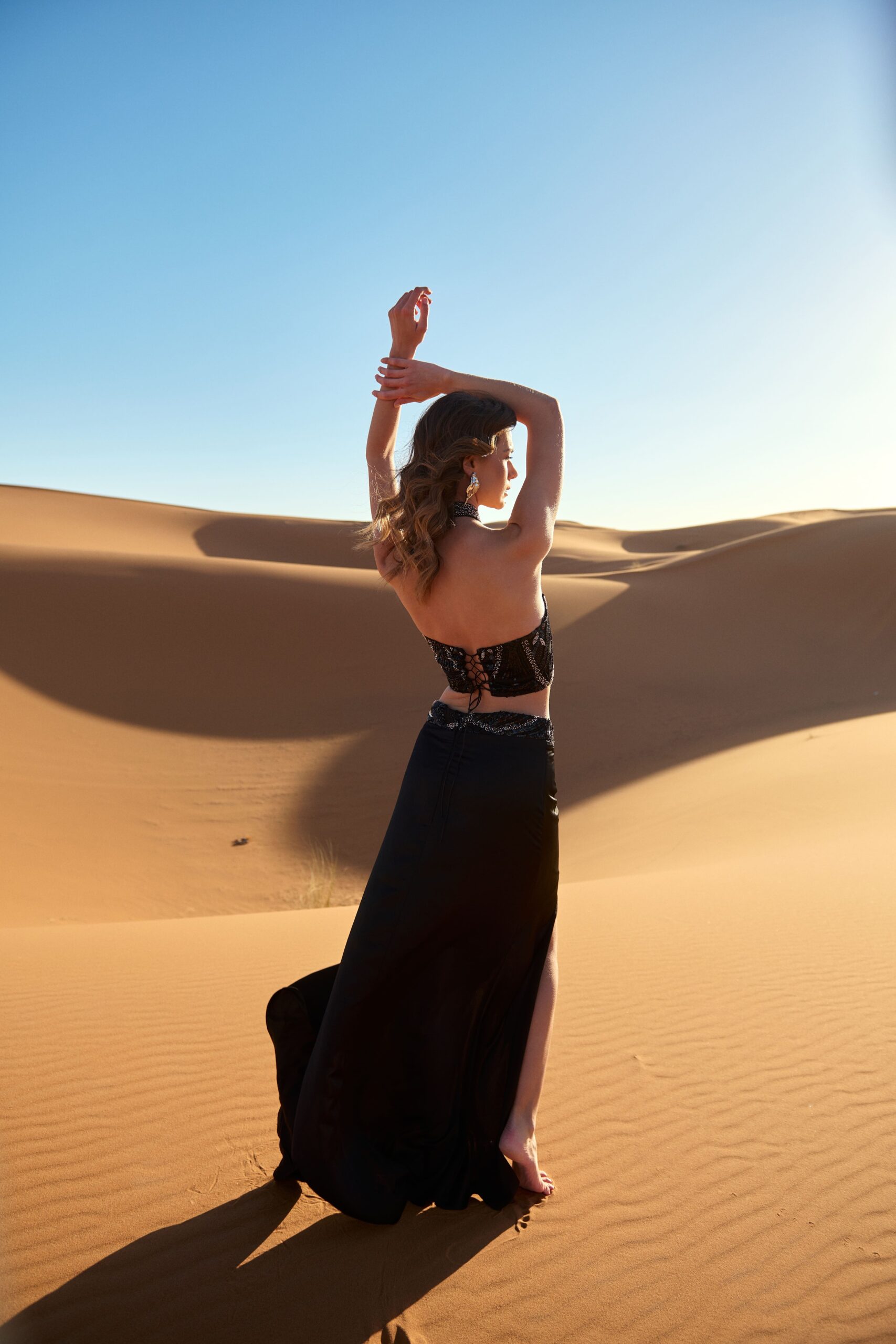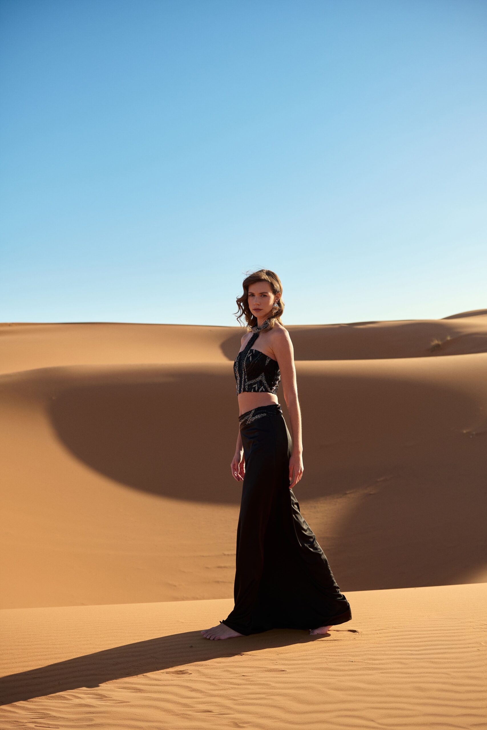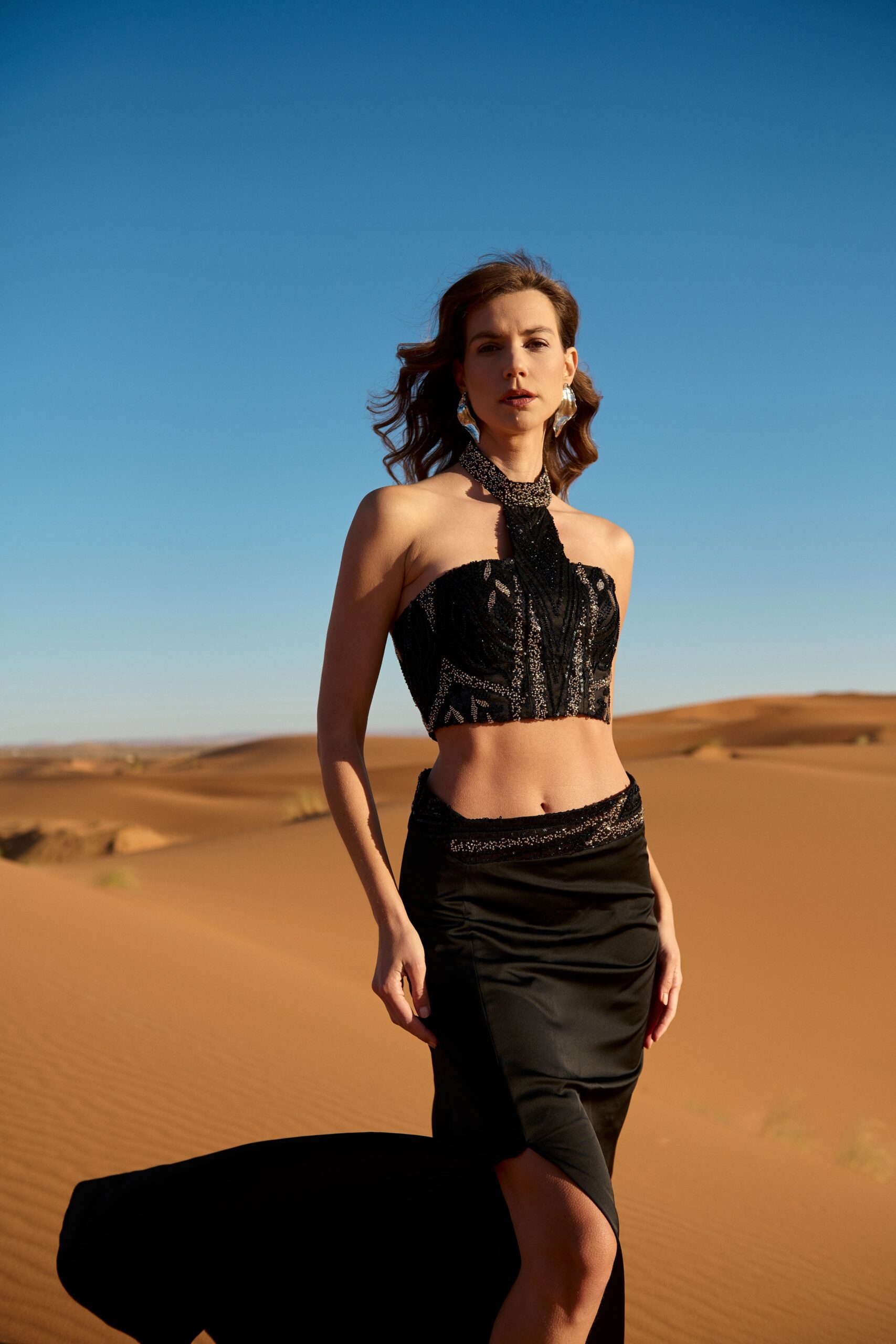Ανακαλύψτε το Σετ Sand Luxury με Κέντημα του Lina & Rene Atelier. Χειροποίητο κεντημένο μπούστο και ασύμμετρη σατινέ φούστα από τη συλλογή Marocco 2026.